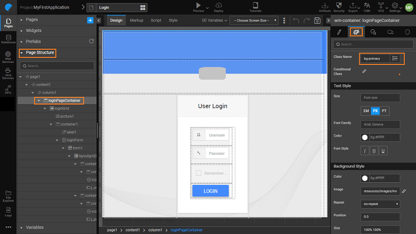 • Select the page container and change the Class name and Image location from the Style property to change the background image and style